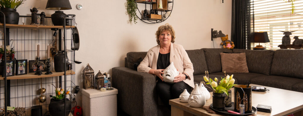 Nellie (59 jaar) begint op 16-jarige leeftijd te werken in een professionele pottenbakkerij. Vijftien jaar lang werkt ze fulltime tussen het stof van de poederklei en de baksels. “Onze haren en onze kleding waren na iedere werkdag grijs van het stof.” Nellie heeft daardoor silicose ontwikkeld, ook wel bekend als stoflongen.
